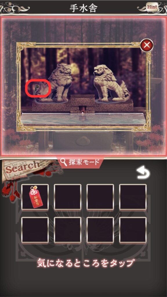 ⇒手水舎の左の狛犬の後ろ