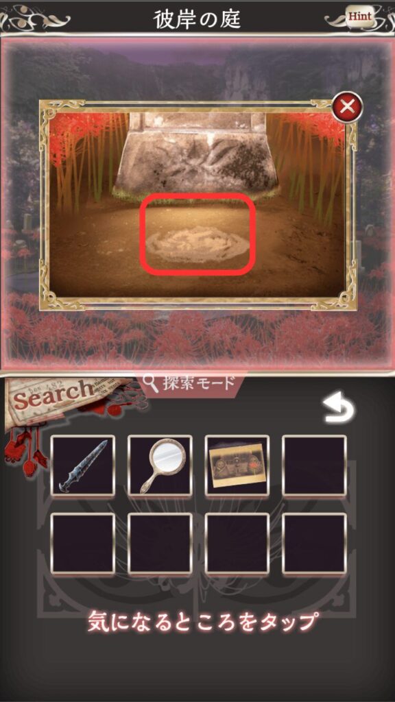 ⇒彼岸の庭の大きな石の前を調べる